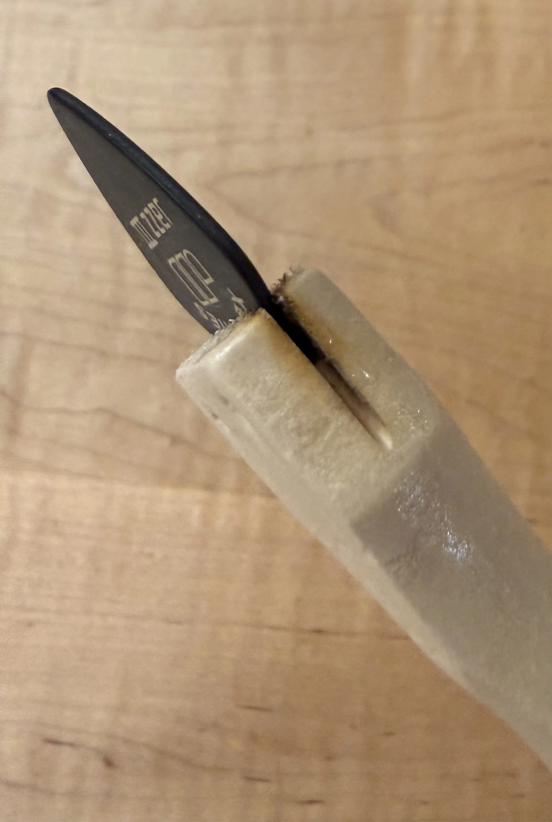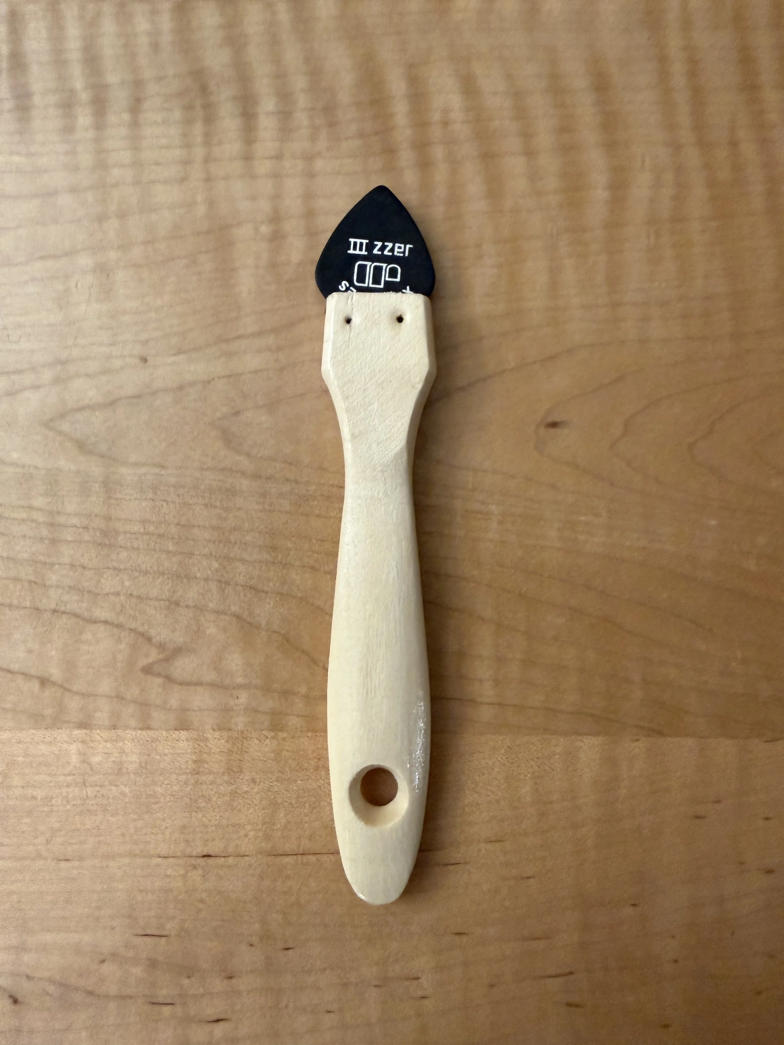 Heavy duty jazz guitar pick glued into a paintbrush handle.